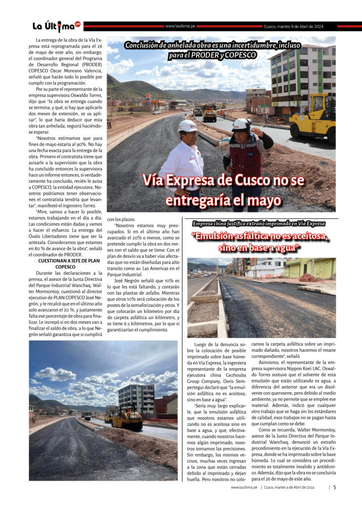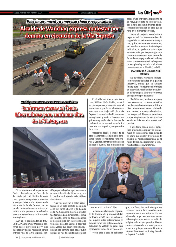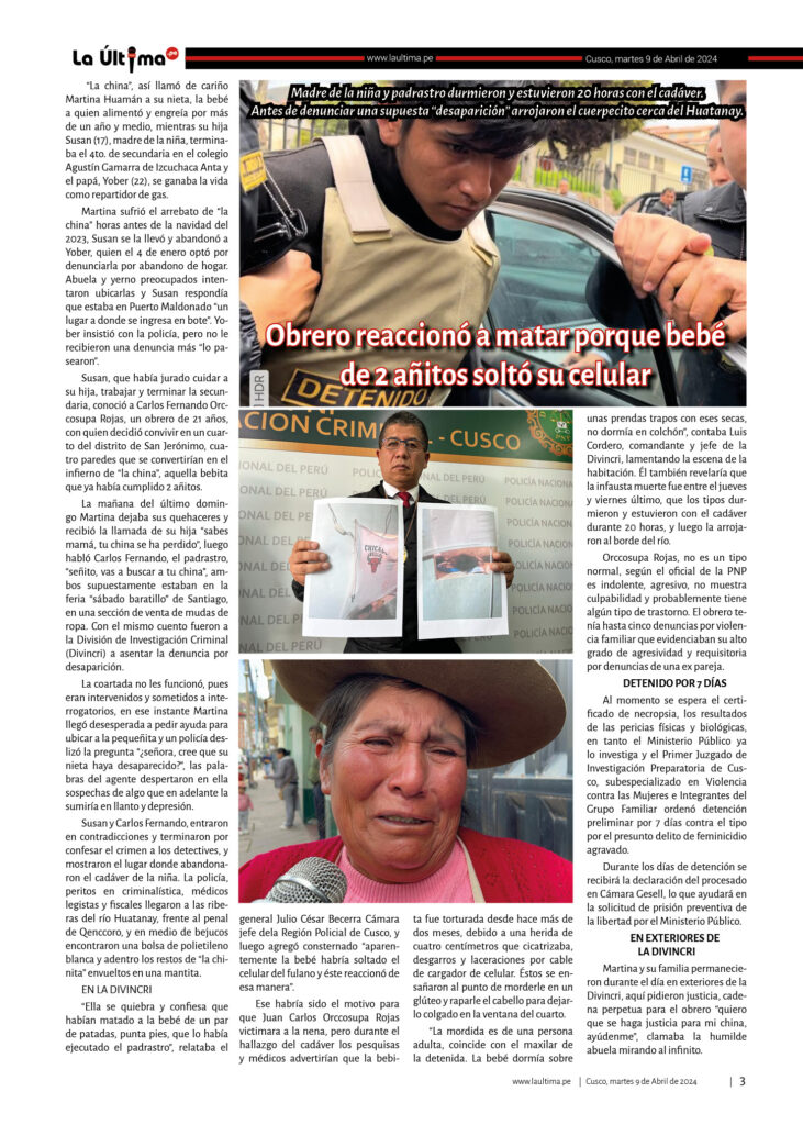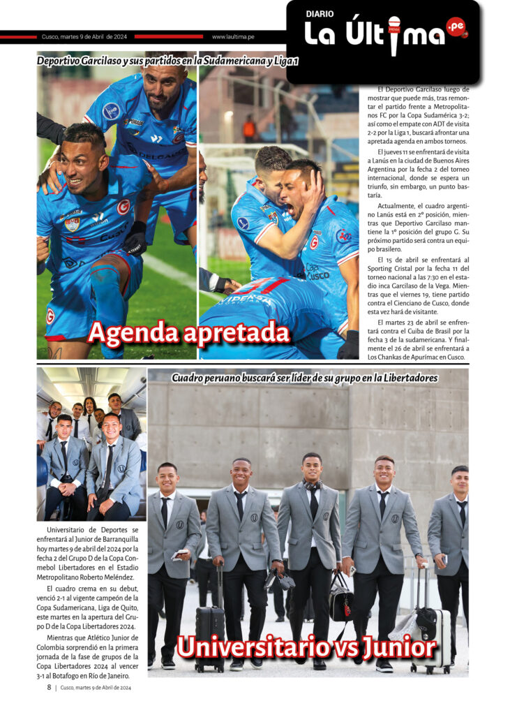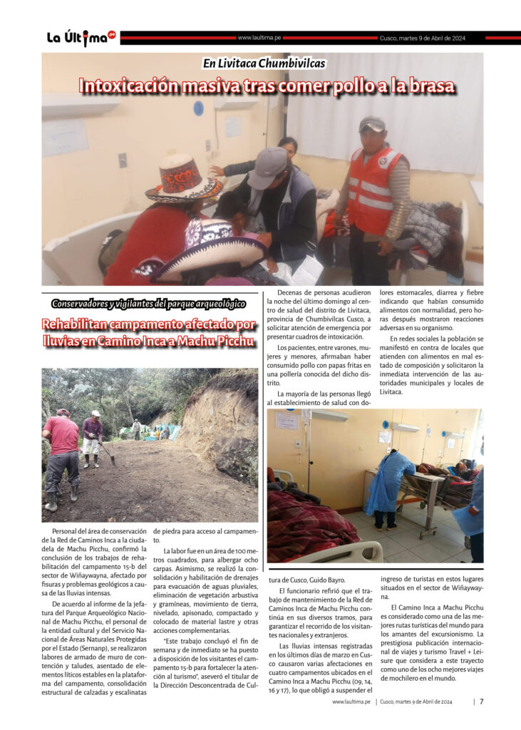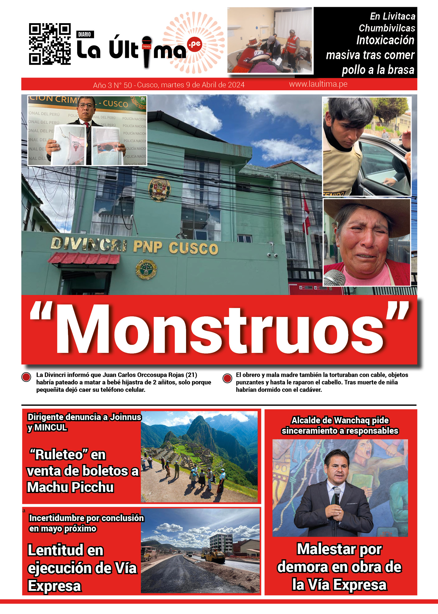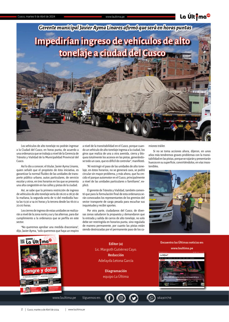 Edicion-impresa La Última 9 de abril de 2024 Published 2 años ago on 9 abril, 2024 By admin Share Tweet 090424Descargar Related Topics: Up Next La Última 10 de abril de 2024 Don't Miss La Última 8 de abril de 2024 Continue Reading You may like Click to comment Leave a Reply Cancelar la respuestaTu dirección de correo electrónico no será publicada. Los campos obligatorios están marcados con *Comentario * Nombre * Correo electrónico * Web Guarda mi nombre, correo electrónico y web en este navegador para la próxima vez que comente. Edicion-impresa LA ÚLTIMA 2 DE JULIO DE 2025 Published 8 meses ago on 2 julio, 2025 By admin 020725Descarga Continue Reading Edicion-impresa LA ÚLTIMA 18 DE JUNIO DE 2025 Published 9 meses ago on 18 junio, 2025 By admin 180625Descarga Continue Reading Edicion-impresa LA ÚLTIMA 13 DE JUNIO DE 2025 Published 9 meses ago on 13 junio, 2025 By admin 130625Descarga Continue Reading Advertisement Más Noticias Sin categoría2 semanas ago Día Internacional de los Osos: La Estación Biológica Wayqecha de Cusco y otras experiencias de conservación Noticias2 semanas ago Cusco acogerá foro estratégico para promover el voto informado Cusco3 semanas ago Cusco busca proteger más de 56 mil hectáreas de bosque amazónico Cusco2 meses ago Gobernador y alcaldes de Cusco usaron canon minero y gasífero para construcciones y compras Cusco2 meses ago Fiscalía investiga a médico cirujano, funcionarios y clínica O2 por muerte con suero defectuoso en Cusco Cusco2 meses ago Contraloría alerta que sobrecarga turística en Machu Picchu Cusco2 meses ago Realizarán trabajos de descolmatación en vía Calca – Yanatile Cusco2 meses ago Piden declaratoria de emergencia tras intensas lluvias en La Convención Cusco2 meses ago Comuneros son heridos tras asalto y robo a mano armada en comunidad de Canas Cusco2 meses ago Gobierno Regional lanza Procompite 2025 para promover trabajo productivo e ingresos de familias Ultimas