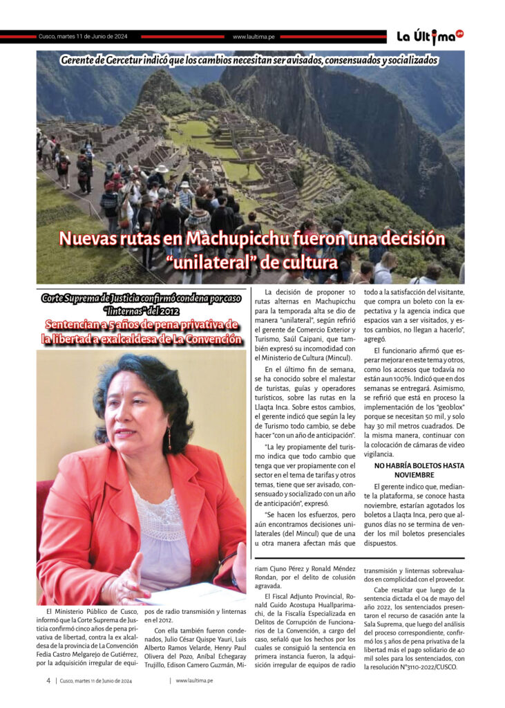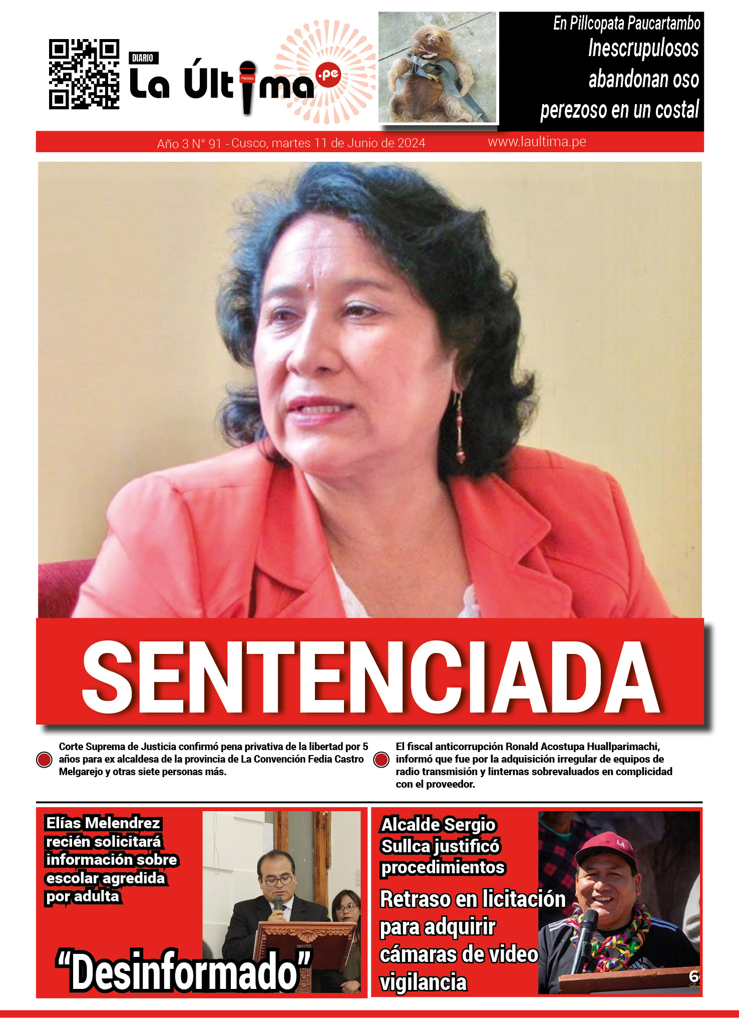 Corte Suprema de Justicia confirmó pena privativa de la libertad por 5 años para ex alcaldesa de la provincia de La Convención Fedia Castro Melgarejo y otras siete personas más.