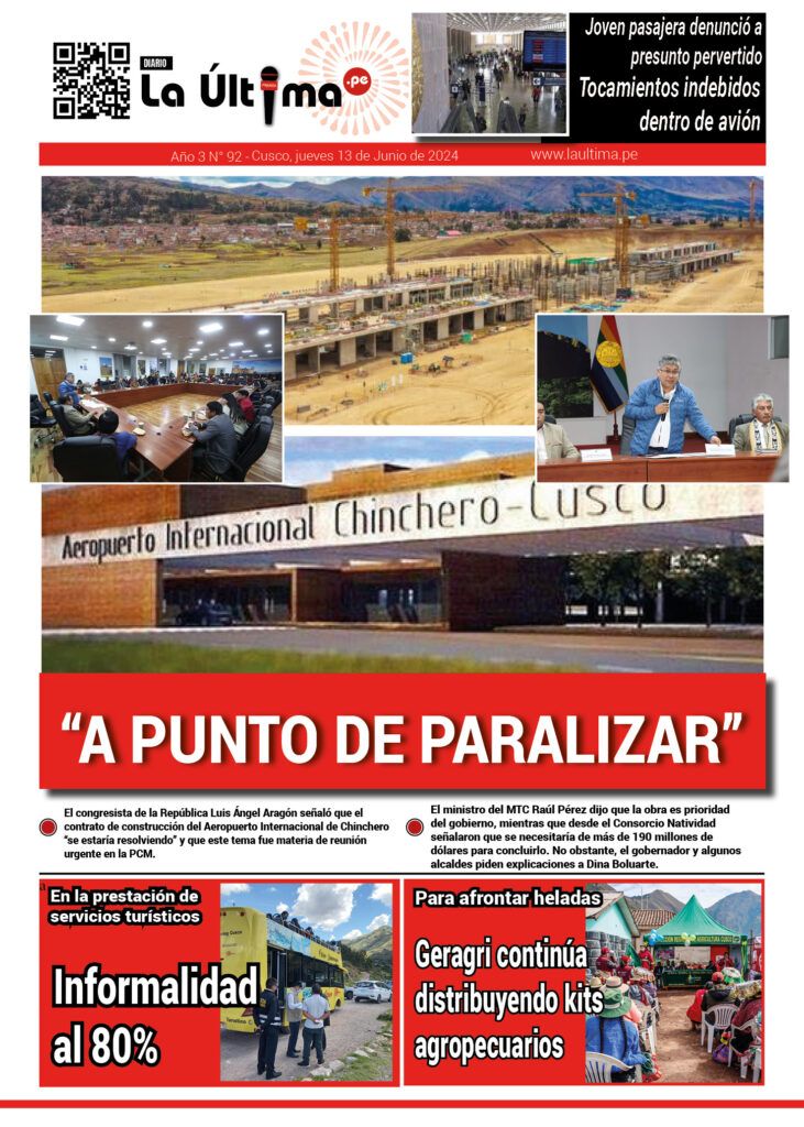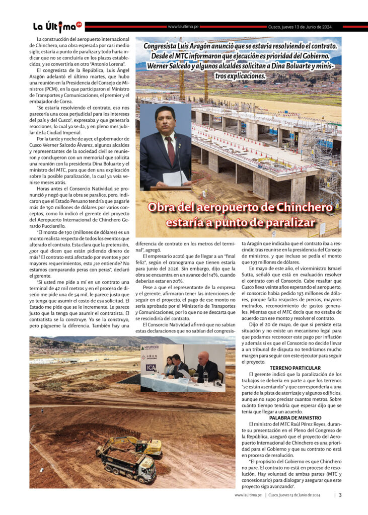 El congresista de la República Luis Ángel Aragón señaló que el contrato de construcción del Aeropuerto Internacional de Chinchero “se estaría resolviendo” y que este tema fue materia de reunión urgente en la PCM.