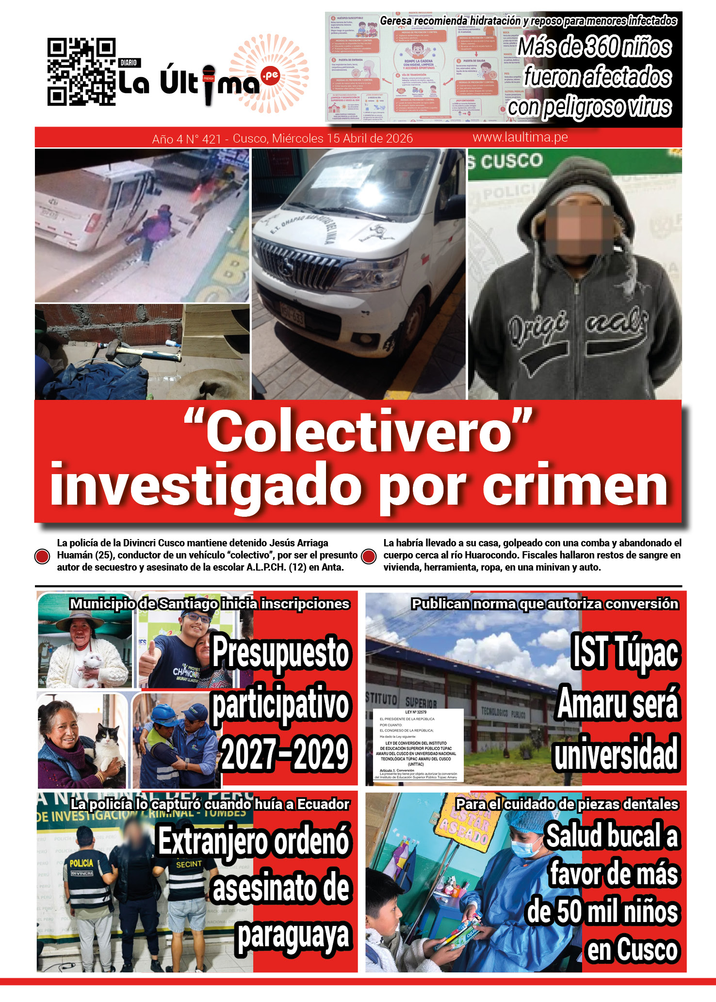 CUSCO, 15 DE ABRIL DE 2026 – Una tragedia ha enlutado a la provincia de Anta. Agentes de la Divincri Cusco capturaron a Jesús Arriaga Huamán (25), quien trabajaba como conductor de «colectivos», por ser el presunto autor del horrendo crimen contra la escolar de iniciales A.L.P.CH. (12).