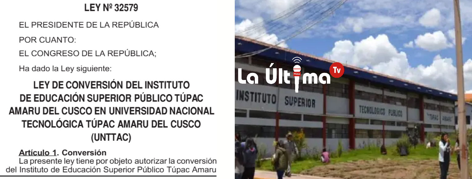 Hoy salió publicado en el diario oficial El Peruano, la Ley Nro. 32579, que dispone la conversión del Instituto de Educación Superior Público Túpac Amaru del Cusco, en Universidad Nacional Tecnológica Túpac Amaru del Cusco, la misma contará con las carreras profesionales y especialidades que actualmente se oferta en dicha institución.