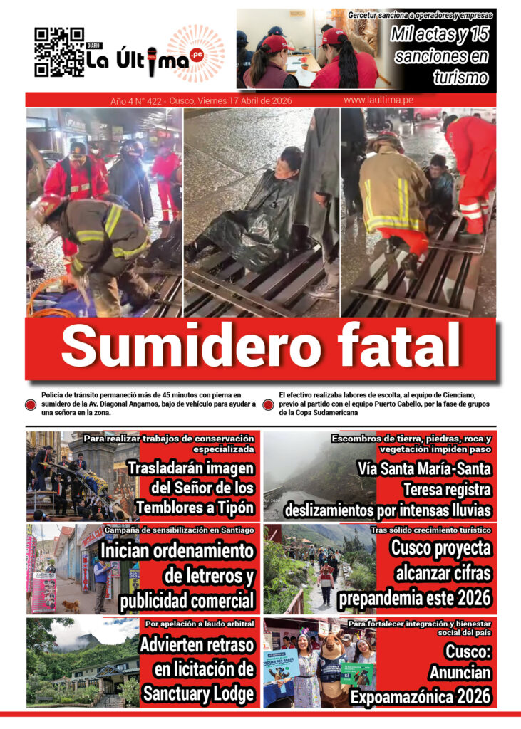 🙏 FE Y CULTURA: Trasladarán la sagrada imagen del Señor de los Temblores hacia Tipón para realizar trabajos de conservación especializada. ¡Cuidado con nuestro Patrón Jurado! 🏨 MACHUPICCHU: Alertan que apelación al laudo arbitral retrasará la nueva licitación para el operador del Sanctuary Lodge. La incertidumbre continúa. 🏔️ TURISMO: ¡Cifras récord! Cusco proyecta alcanzar este 2026 los niveles de visitas que tenía antes de la pandemia. 📈 🚧 EMERGENCIA: Intensas lluvias provocan nuevos deslizamientos en la vía Santa María – Santa Teresa. El paso de vehículos está restringido por escombros y rocas. 📢 SANTIAGO: ¡Poniendo orden! Municipio inicia campaña de sensibilización para el retiro de letreros y publicidad comercial invasiva. ⚖️ FISCALIZACIÓN: Gercetur no perdona: Reportan mil actas de inspección y 15 sanciones a empresas turísticas por mal servicio. 🌴 EVENTO: Todo va quedando listo para la Expoamazónica 2026 en Cusco, buscando fortalecer la integración nacional.