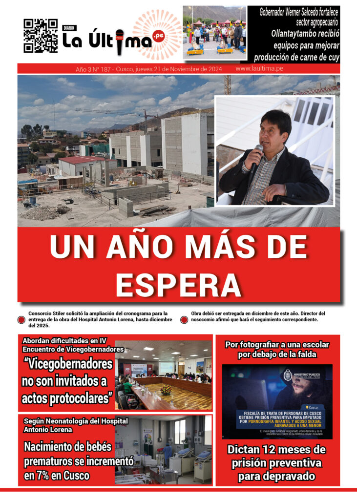 Edicion-impresa La Última 21 de noviembre de 2024 Published 1 año ago on 21 noviembre, 2024 By admin Share Tweet 211124Descarga Related Topics:cusco Up Next La Última 22 de noviembre de 2024 Don't Miss La Última 20 de noviembre de 2024 Continue Reading You may like Padres exigen nueva infraestructura para I. E. I. San Borja en el buen inicio del año escolar 2026 Oro ilegal ya iguala al legal y se crean seis nuevas procesadoras cada día Investigan si funcionarios de Cultura favorecieron en trámites a proyecto extranjero Pi Rambla en Cusco El día que Jorge Núñez Del Prado ofreció serenata a la Virgen Del Carmen en Paucartambo Oro robado en Cusco: un asalto a mano armada de más de S/40 millones a dos mineros Puente Enrique P. Mejía de la ciudad de Sicuani será ejecutada por administración directa y una inversión de más de 5 millones de soles Click to comment Leave a Reply Cancelar la respuestaTu dirección de correo electrónico no será publicada. Los campos obligatorios están marcados con *Comentario * Nombre * Correo electrónico * Web Guarda mi nombre, correo electrónico y web en este navegador para la próxima vez que comente. Edicion-impresa LA ÚLTIMA 2 DE JULIO DE 2025 Published 9 meses ago on 2 julio, 2025 By admin 020725Descarga Continue Reading Edicion-impresa LA ÚLTIMA 18 DE JUNIO DE 2025 Published 9 meses ago on 18 junio, 2025 By admin 180625Descarga Continue Reading Edicion-impresa LA ÚLTIMA 13 DE JUNIO DE 2025 Published 9 meses ago on 13 junio, 2025 By admin 130625Descarga Continue Reading Advertisement Más Noticias Cusco5 horas ago Padres exigen nueva infraestructura para I. E. I. San Borja en el buen inicio del año escolar 2026 Sin categoría6 horas ago Oro ilegal ya iguala al legal y se crean seis nuevas procesadoras cada día Cusco4 días ago Investigan si funcionarios de Cultura favorecieron en trámites a proyecto extranjero Pi Rambla en Cusco Cusco4 días ago El día que Jorge Núñez Del Prado ofreció serenata a la Virgen Del Carmen en Paucartambo Cusco4 días ago Oro robado en Cusco: un asalto a mano armada de más de S/40 millones a dos mineros Cusco4 días ago Puente Enrique P. Mejía de la ciudad de Sicuani será ejecutada por administración directa y una inversión de más de 5 millones de soles Cusco5 días ago Nativos acusan al Ejecutivo de ignorar daños tras deflagración de tubería de Gas en Bajo Urubamba Cusco5 días ago Gobernador de Cusco: MTC tendrá que aclarar sobre competencia en vía a Machu Picchu Cusco5 días ago Hospital A. Lorena: contrataron 45 profesionales, técnicos y auxiliares sin concurso público de mérito e igualdad Cusco5 días ago Denuncian a dirigente de los transportistas Estanislao Alegre por anunciar incremento del pasaje a S/ 1.50 sin sustento técnico Ultimas Sin categoría6 horas ago Oro ilegal ya iguala al legal y se crean seis nuevas procesadoras cada día Cusco5 horas ago Padres exigen nueva infraestructura para I. E. I. San Borja en el buen inicio del año escolar 2026