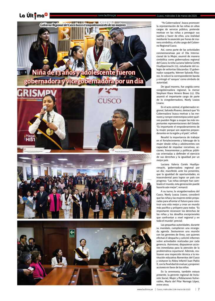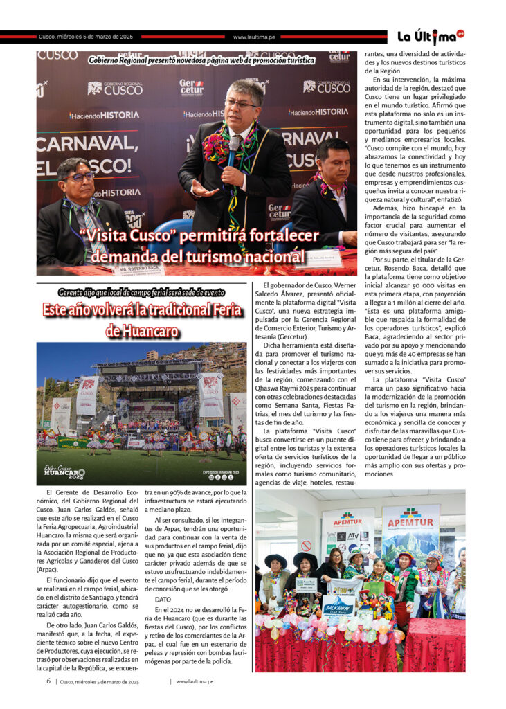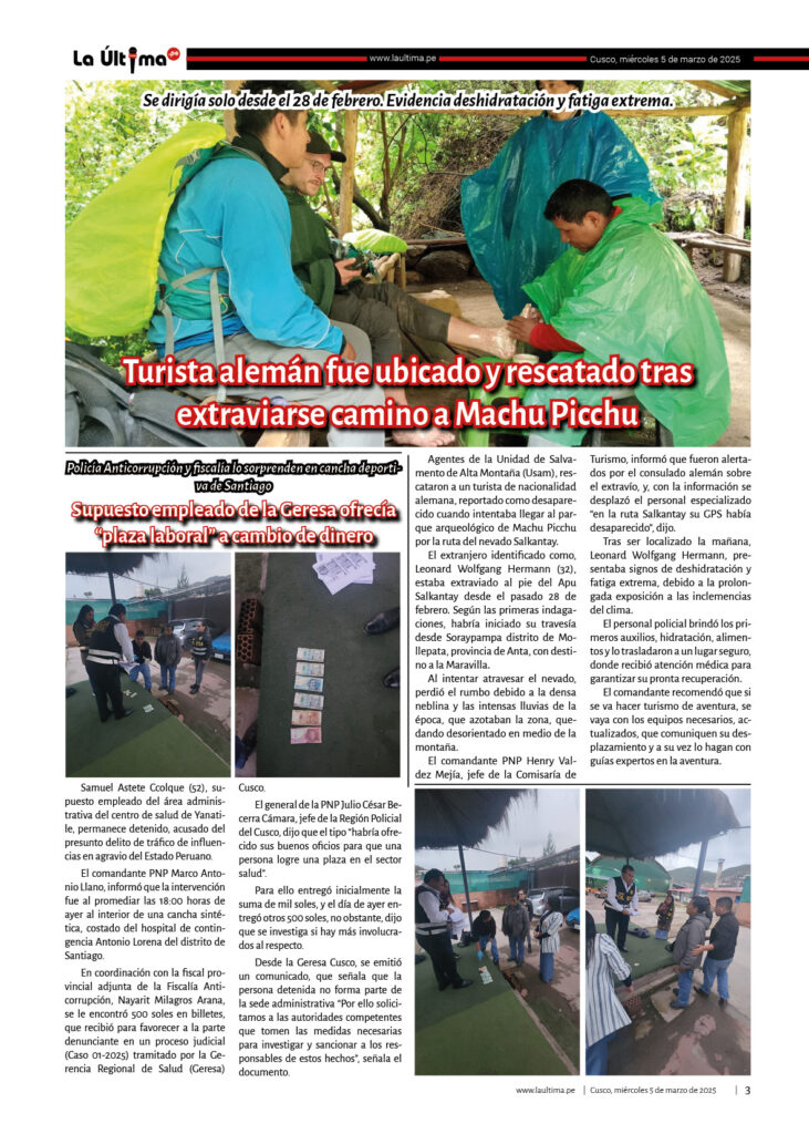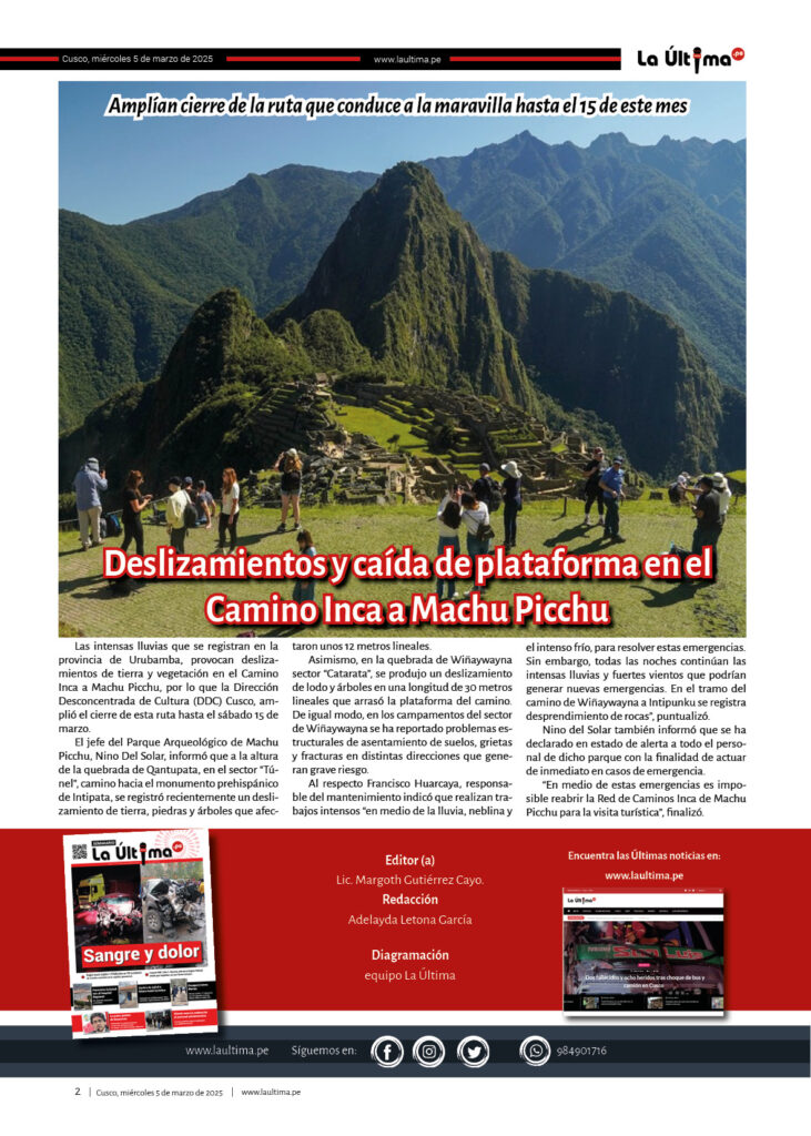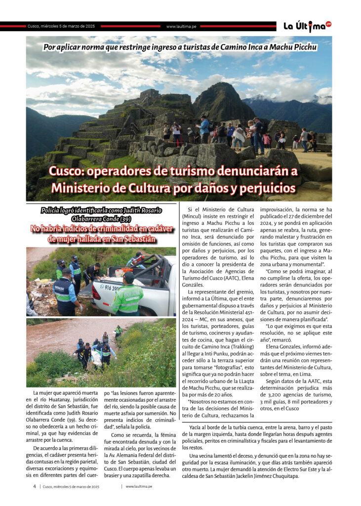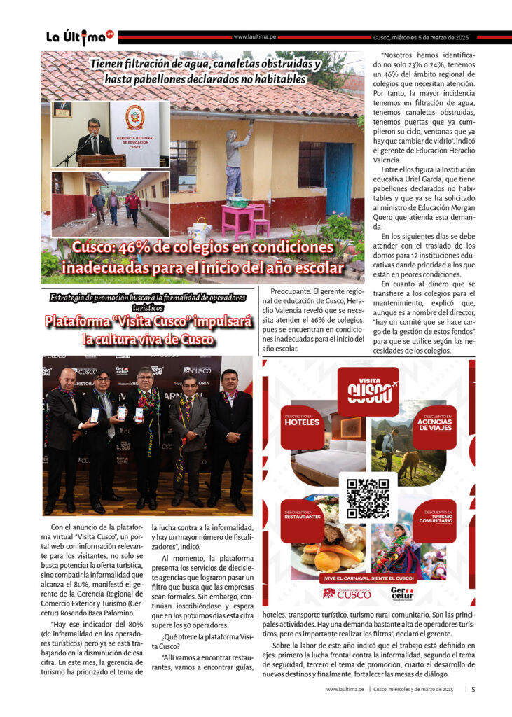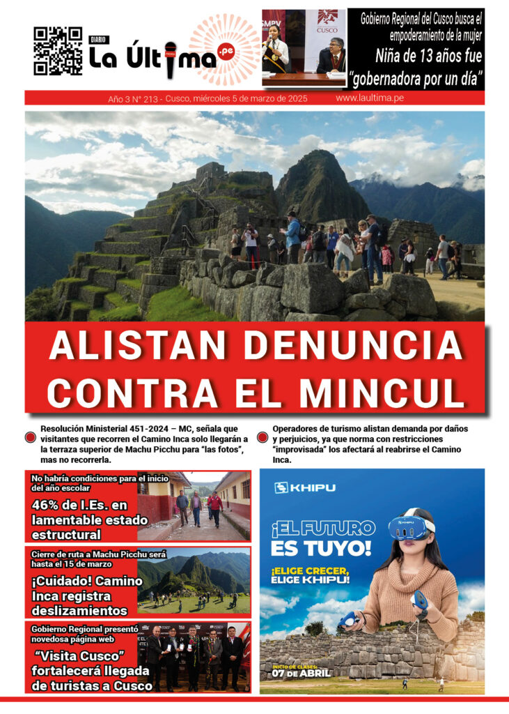 Edicion-impresa La Última 5 de marzo de 2025 Published 1 año ago on 5 marzo, 2025 By admin Share Tweet 050325Descarga Related Topics:cusco Up Next LA ÚLTIMA 6 DE MARZO DE 2025 Don't Miss La Última 4 de marzo de 2025 Continue Reading You may like Padres exigen nueva infraestructura para I. E. I. San Borja en el buen inicio del año escolar 2026 Oro ilegal ya iguala al legal y se crean seis nuevas procesadoras cada día Investigan si funcionarios de Cultura favorecieron en trámites a proyecto extranjero Pi Rambla en Cusco El día que Jorge Núñez Del Prado ofreció serenata a la Virgen Del Carmen en Paucartambo Oro robado en Cusco: un asalto a mano armada de más de S/40 millones a dos mineros Puente Enrique P. Mejía de la ciudad de Sicuani será ejecutada por administración directa y una inversión de más de 5 millones de soles Click to comment Leave a Reply Cancelar la respuestaTu dirección de correo electrónico no será publicada. Los campos obligatorios están marcados con *Comentario * Nombre * Correo electrónico * Web Guarda mi nombre, correo electrónico y web en este navegador para la próxima vez que comente. Edicion-impresa LA ÚLTIMA 2 DE JULIO DE 2025 Published 9 meses ago on 2 julio, 2025 By admin 020725Descarga Continue Reading Edicion-impresa LA ÚLTIMA 18 DE JUNIO DE 2025 Published 9 meses ago on 18 junio, 2025 By admin 180625Descarga Continue Reading Edicion-impresa LA ÚLTIMA 13 DE JUNIO DE 2025 Published 9 meses ago on 13 junio, 2025 By admin 130625Descarga Continue Reading Advertisement Más Noticias Cusco5 horas ago Padres exigen nueva infraestructura para I. E. I. San Borja en el buen inicio del año escolar 2026 Sin categoría6 horas ago Oro ilegal ya iguala al legal y se crean seis nuevas procesadoras cada día Cusco4 días ago Investigan si funcionarios de Cultura favorecieron en trámites a proyecto extranjero Pi Rambla en Cusco Cusco4 días ago El día que Jorge Núñez Del Prado ofreció serenata a la Virgen Del Carmen en Paucartambo Cusco4 días ago Oro robado en Cusco: un asalto a mano armada de más de S/40 millones a dos mineros Cusco4 días ago Puente Enrique P. Mejía de la ciudad de Sicuani será ejecutada por administración directa y una inversión de más de 5 millones de soles Cusco5 días ago Nativos acusan al Ejecutivo de ignorar daños tras deflagración de tubería de Gas en Bajo Urubamba Cusco5 días ago Gobernador de Cusco: MTC tendrá que aclarar sobre competencia en vía a Machu Picchu Cusco5 días ago Hospital A. Lorena: contrataron 45 profesionales, técnicos y auxiliares sin concurso público de mérito e igualdad Cusco5 días ago Denuncian a dirigente de los transportistas Estanislao Alegre por anunciar incremento del pasaje a S/ 1.50 sin sustento técnico Ultimas Sin categoría6 horas ago Oro ilegal ya iguala al legal y se crean seis nuevas procesadoras cada día Cusco5 horas ago Padres exigen nueva infraestructura para I. E. I. San Borja en el buen inicio del año escolar 2026