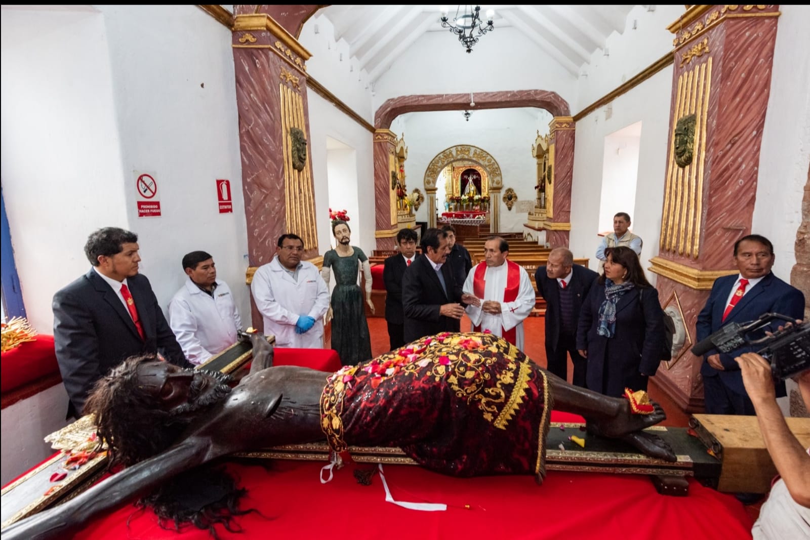 Al llegar a los exteriores de los talleres, monseñor Israel Condorhuamán, representante del Arzobispado del Cusco, ofreció una homilía y bendijo a los trabajadores de la entidad cultural, quienes verificarán los espacios donde xilófagos anidaron y carcomen el maguey, madera que forma parte de la estructura de la sagrada imagen.