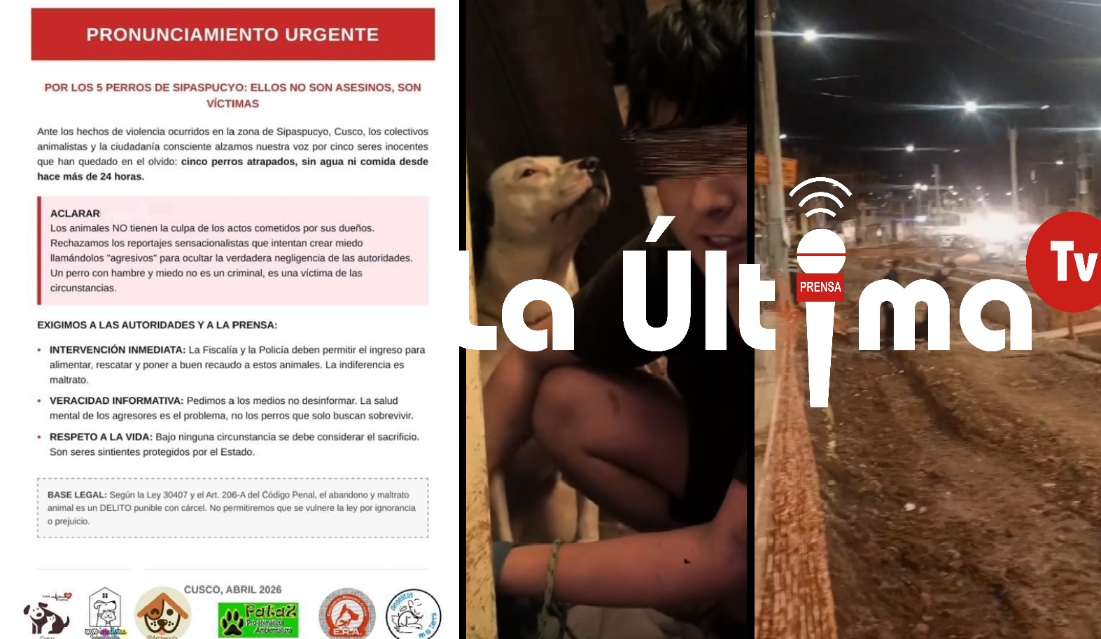 Seis colectivos animalistas a través de un comunicado público rechazaron la posibilidad de “sacrificar” a los cinco canes que fueron hallados al interior de una vivienda, en Sipaspucyo, distrito de Santiago (Cusco), lugar donde se produjo un macabro hallazgo, en las últimas horas. Estas son: Entre patitas, Animalista Independientes, Amiwoofs, Pata 2 Pro animalista Aambientalistas, Angelitos en la Tierra, E.R.A.