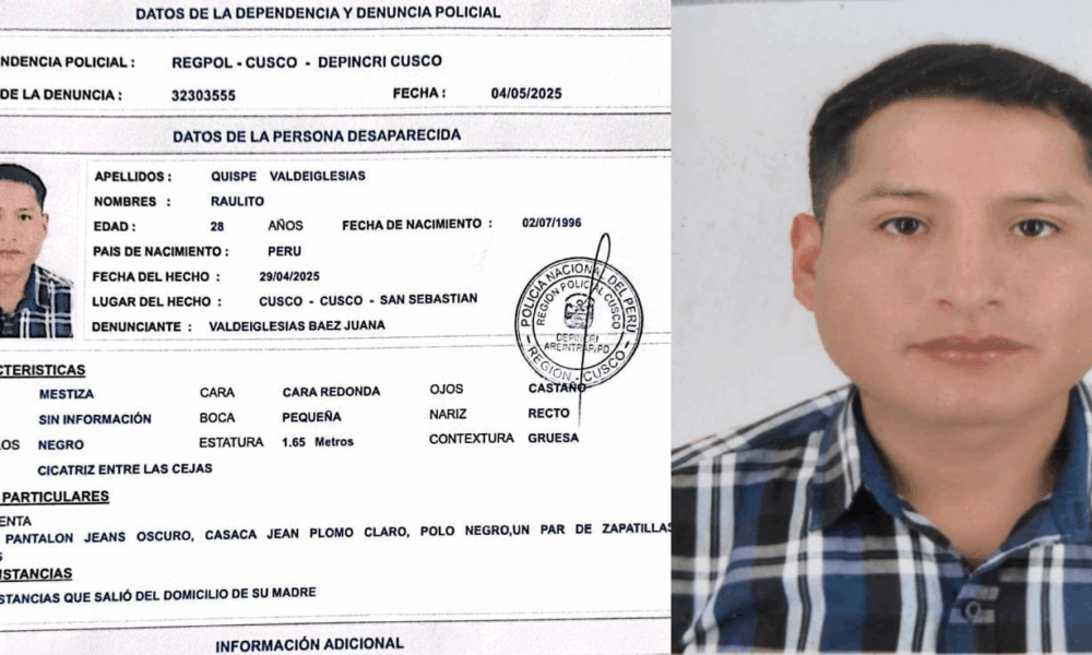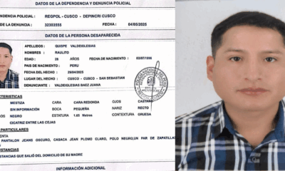El área de investigación de personas desaparecidas del Departamento de InvestigaciónCriminal (Depincri) Cusco, informó que el ciudadano identificado como, Raulito QuispeValdeiglesias (28), lleva desaparecido desde el...